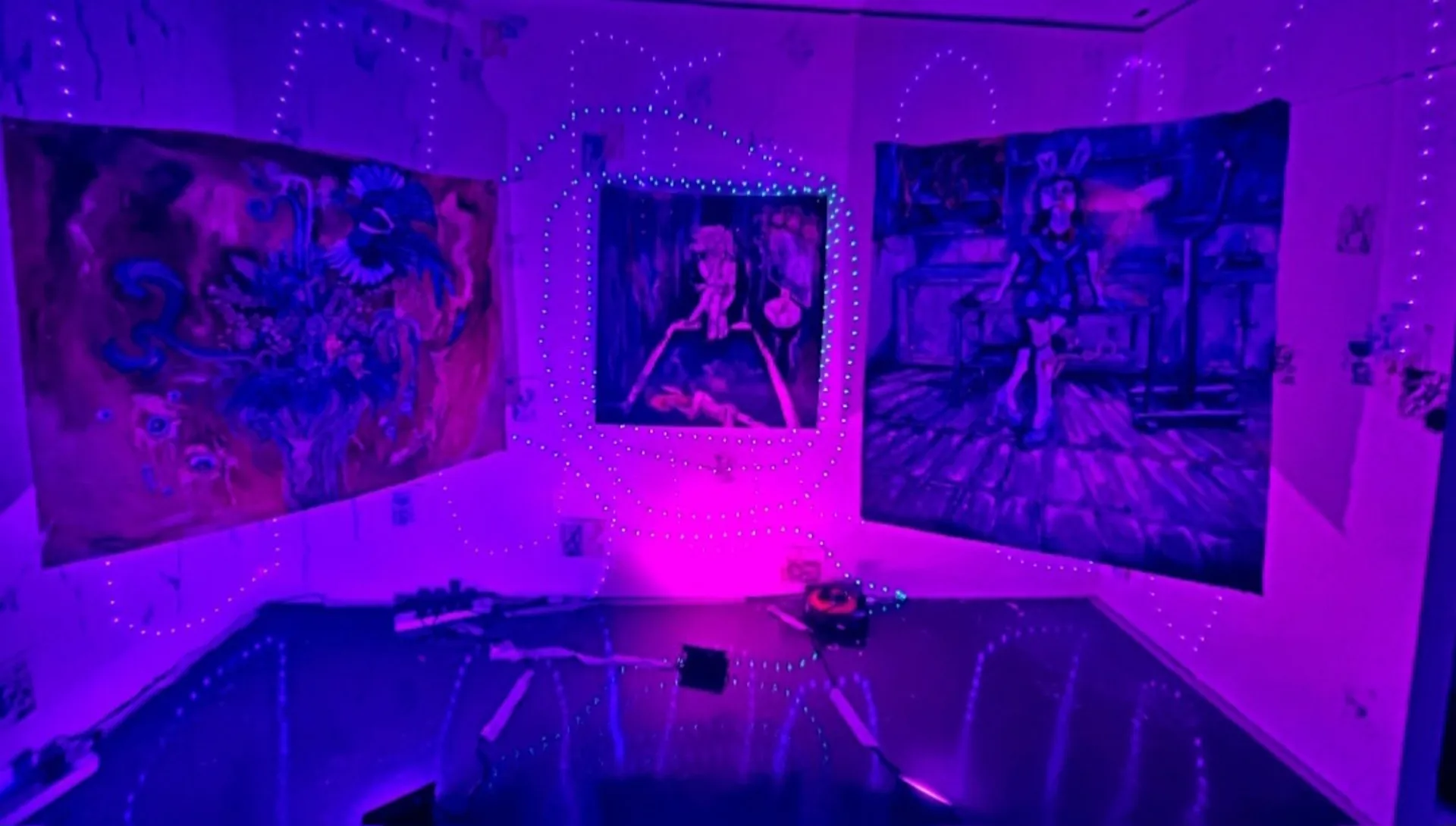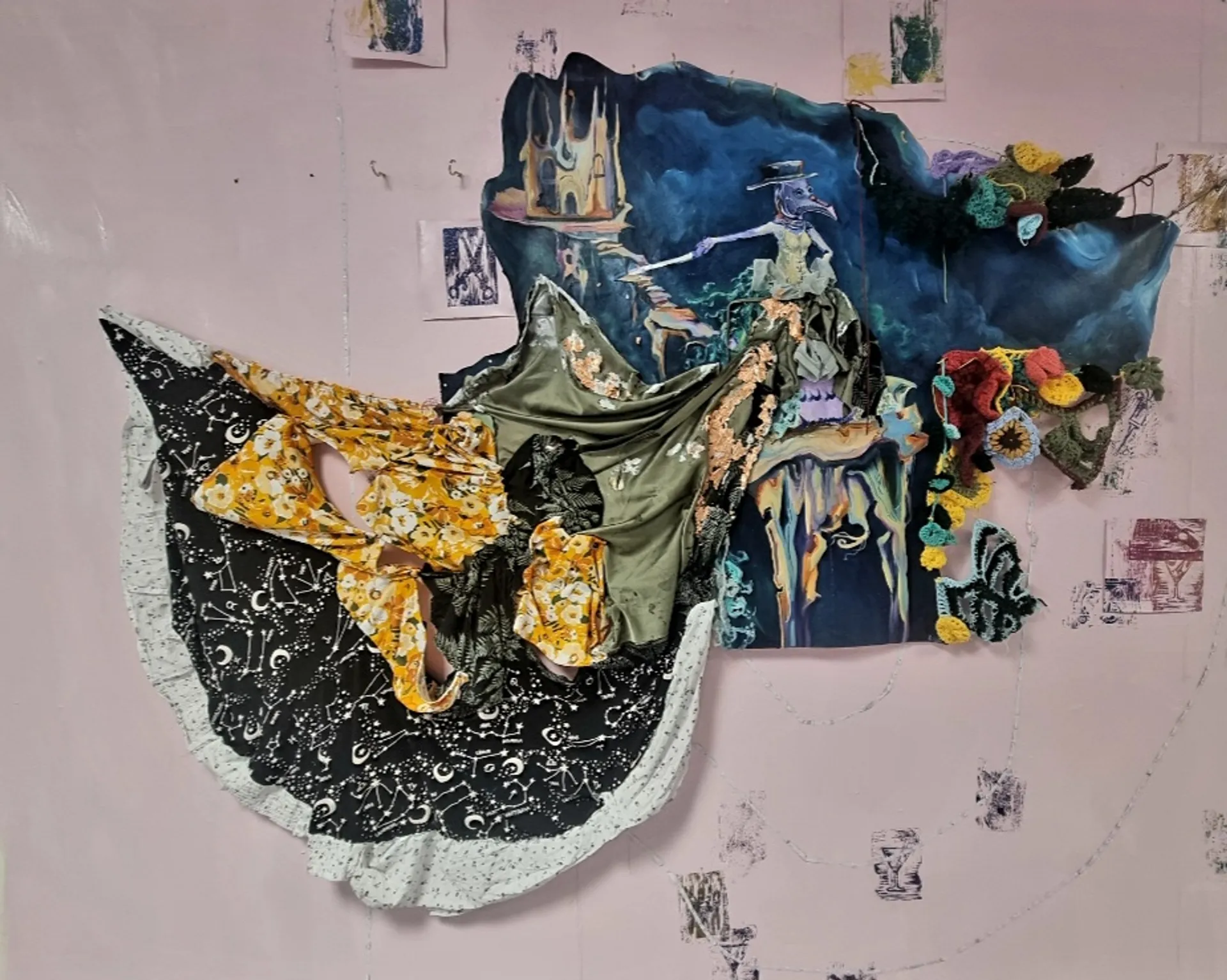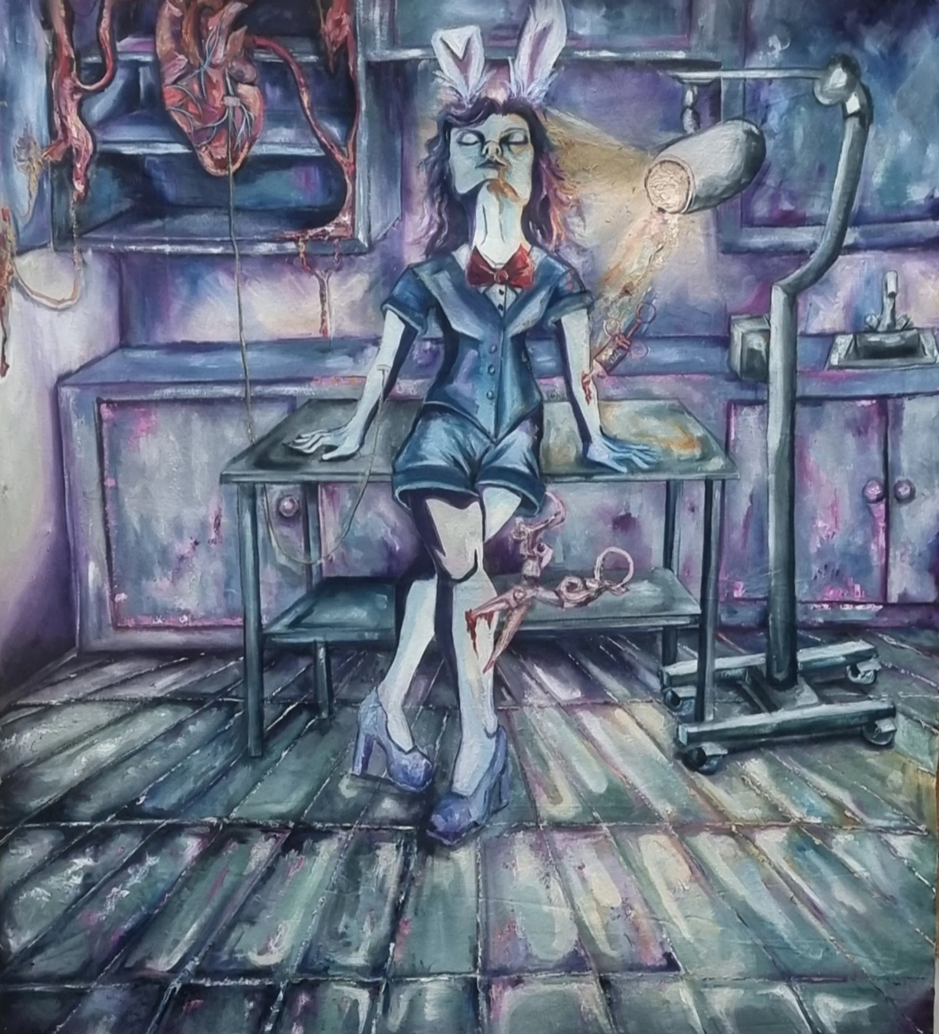 I primarily focus on ‘Installation Oil Paintings’; the symbolic messages extend beyond the canvas through the use of lighting and set design, blurring the lines between painting and installation. These immersive paintings aim to break down the alienating wall that static paintings can possess, creating an all consuming other-worldly atmosphere. These portals to other dimensions are fantasy in nature and focus around criticising our current political landscape and the exploration of personal experiences. Previous work explored ideas around inner turmoil and mental health, while current work focuses around Fantasy and Feminism through the exploration of hybrid figures and a transhumanist narrative.