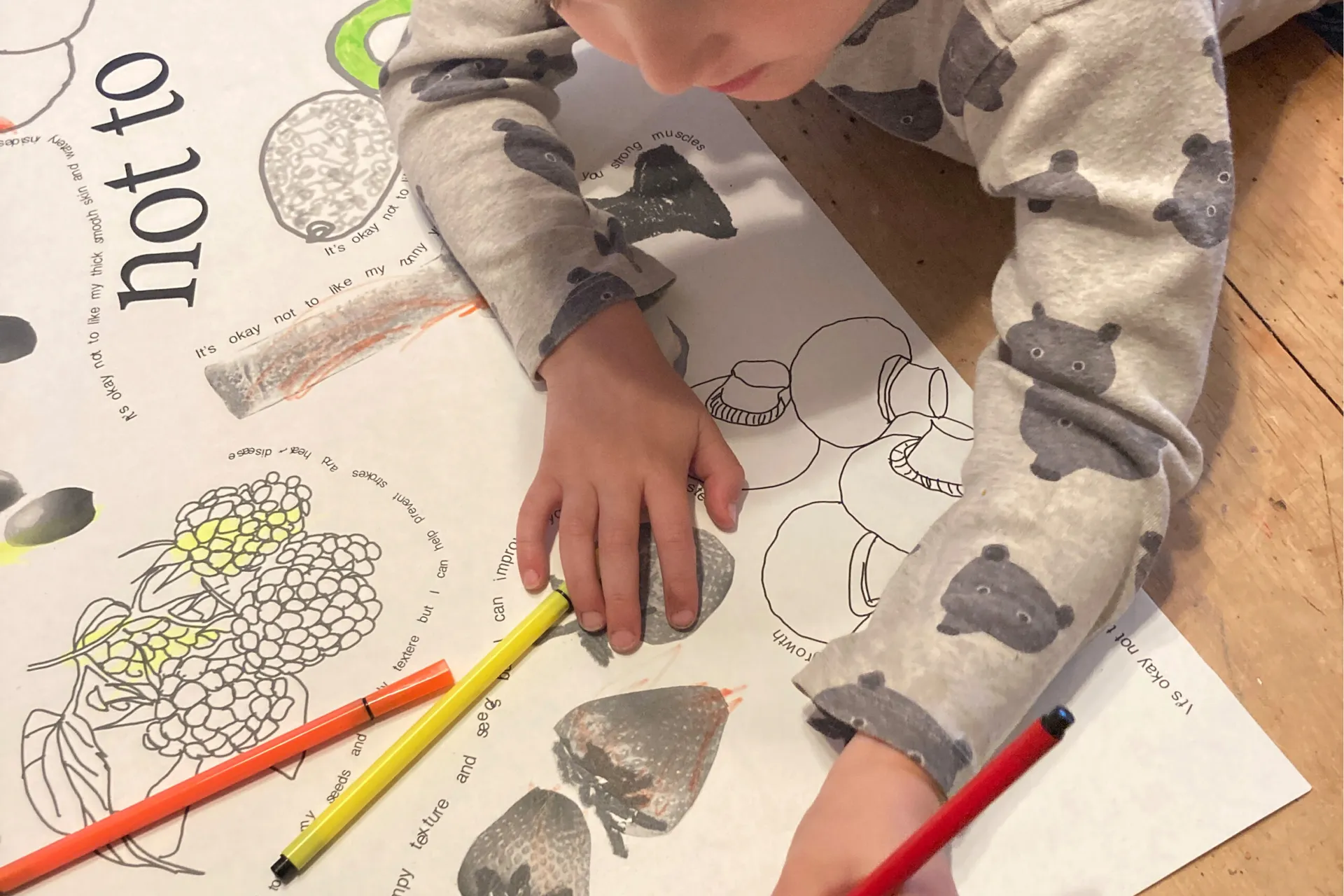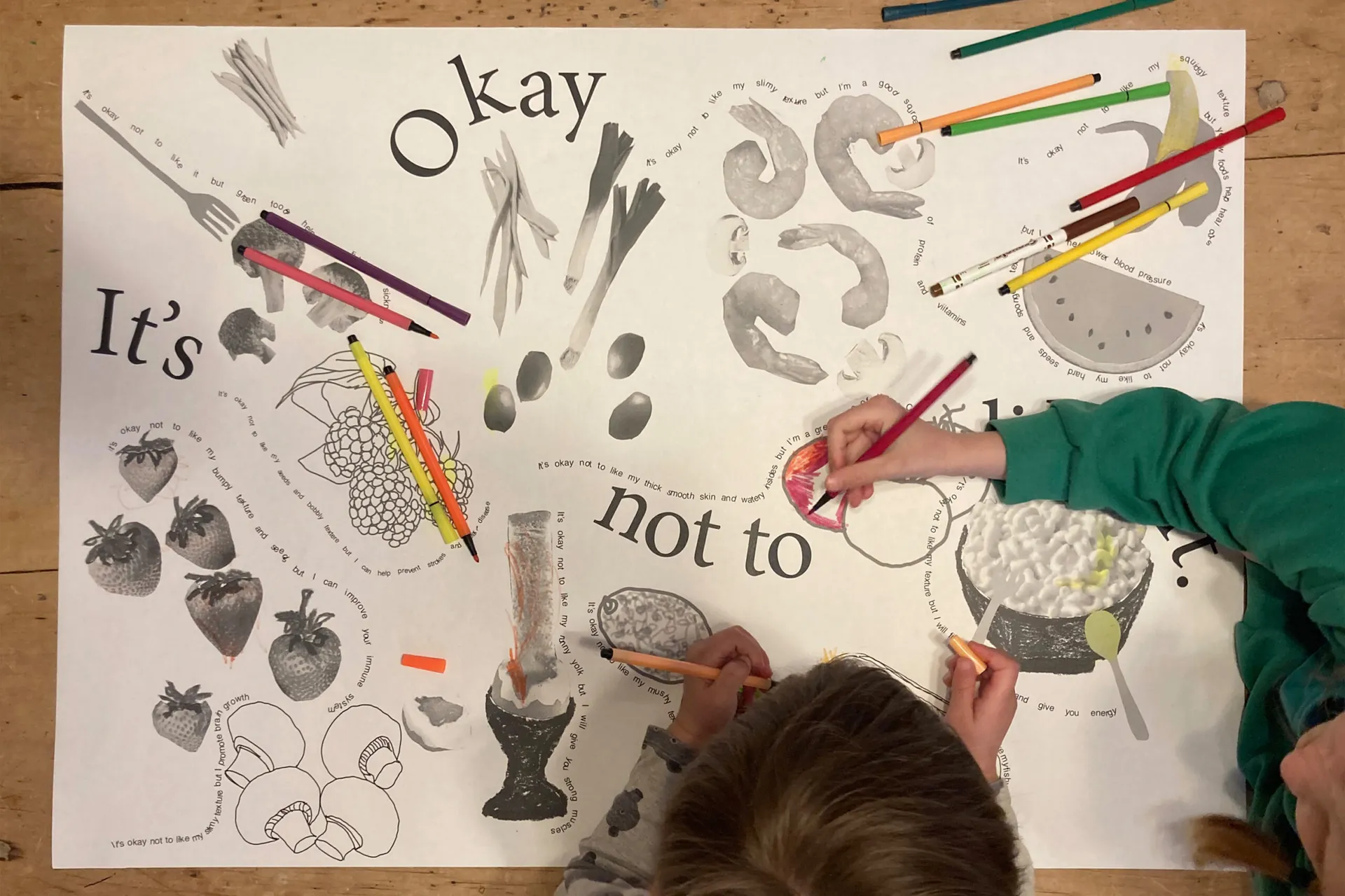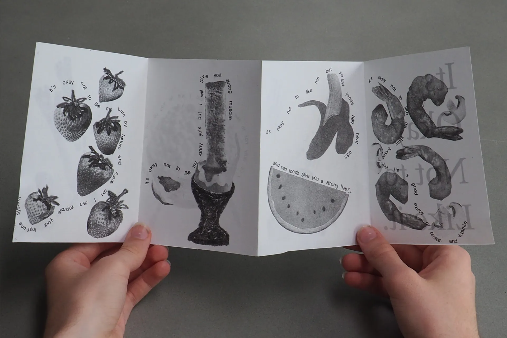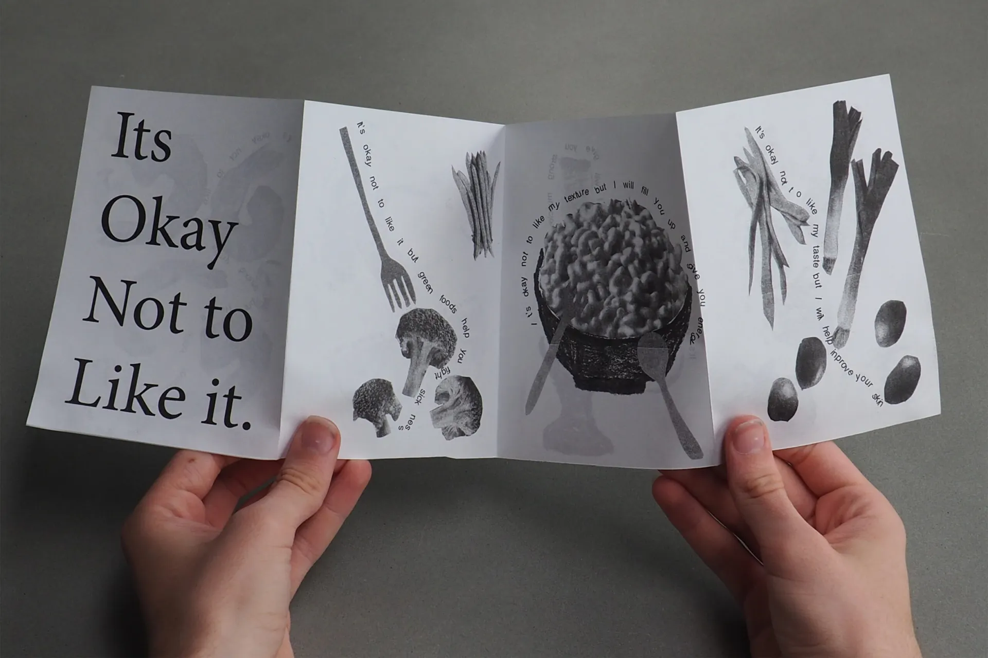 For my final piece for my FMP, I have made an A1 placemat and a set of 60 risographed concertinas to go alongside it. My A1 placemat features different collaged black and white images of food alongside linear outlines of food which children may wish to colour in. The food which features on this placemat is based off research which I collected of food which people may have not liked as a child. Therefore the idea of this outcome is to encourage children to try new foods and not to be afraid of appearance, taste and texture. Using indesign, I also chose to write different sentences around the food which directly relates to it and may encourage the child to try it. The main slogan of the outcome, “it’s okay not to like it”, is meant to play into nostalgia and also remind a child that it is okay not to like a food but it is important to try it. The smaller risographed concertinas features a similar graphic and concept to what is on the A1 piece however the concept for this is that because of its smaller scale it can be more easily given out and taken away. Similarly to the A1 mat, the photographs of food featured on this are printed in black and white, therefore it is possible for this also to be coloured in and hopefully help children subconsciously feel more comfortable with food by interacting with the piece and thinking about it.