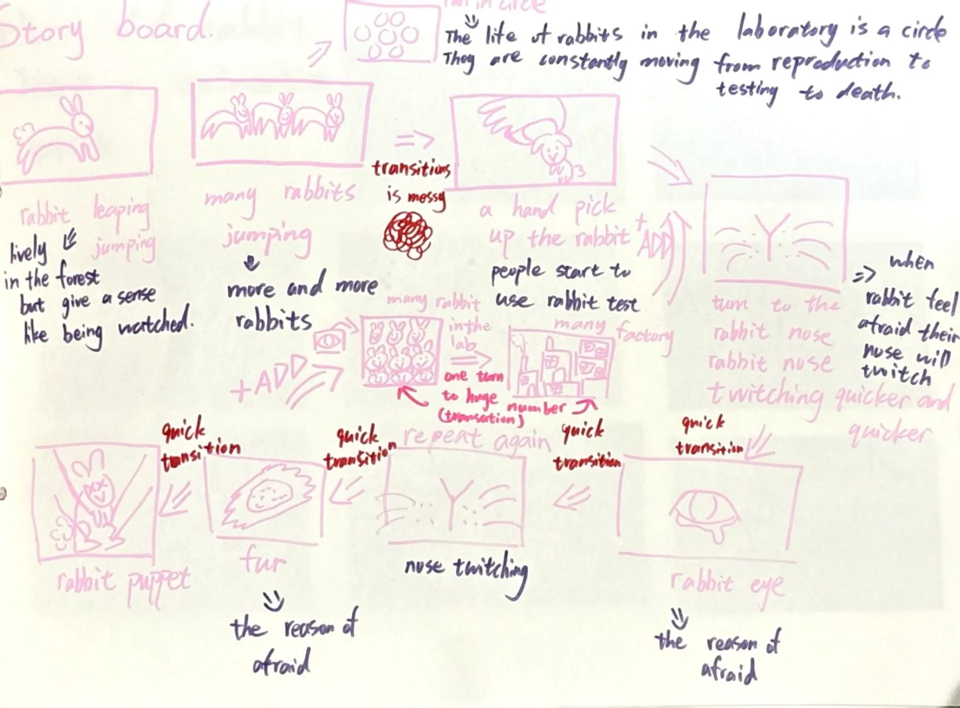 In this animation, I delve into the dark world of cosmetic testing as experienced by innocent rabbits. At the heart of this story are the rabbits, once free to roam the lush forests they called home, now confined within the stark, unforgiving walls of a cosmetics factory. The animation exposes the misuse of rabbits in the cosmetics industry and champions their right to freedom. It’s a call to action—a plea for compassion and change, urging us to envision and strive for a world where rabbits roam freely in the forest once again.