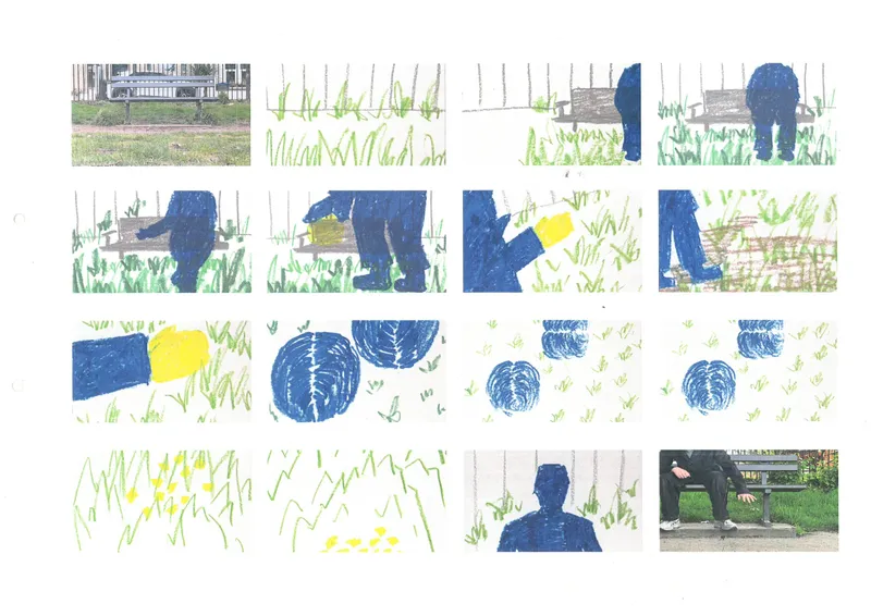 The four images in the footer show a process of my final product to have a better understanding. They show my realistic reference storyboard, the final storyboard, the testing of the image effects, and the outcome subplot.