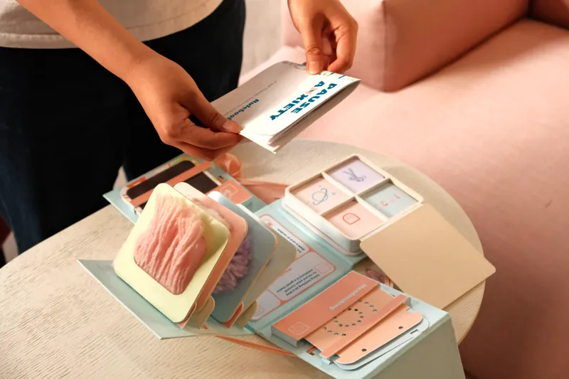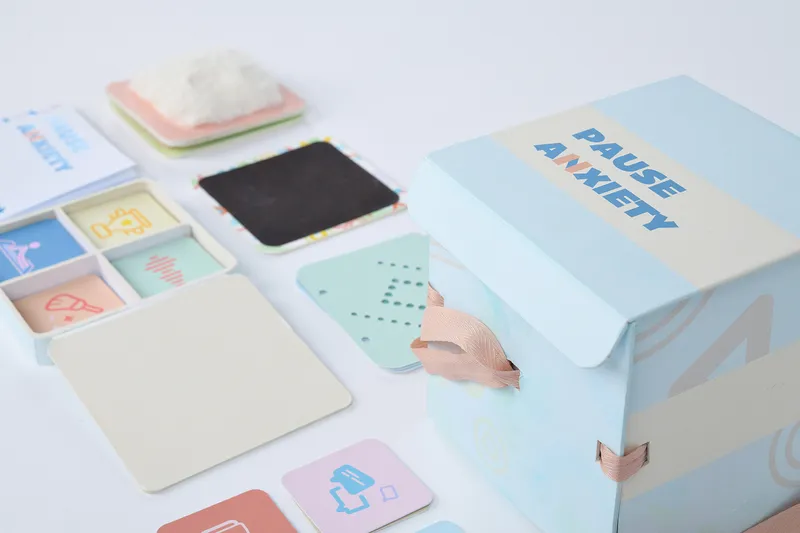 “Pause Anxiety” is a therapy toolkit designed specifically for international students. It is designed to be used at home, school, or work to help reduce anxiety and provide guidance on managing stress. The toolkit includes relaxation techniques, cognitive aids, sensory cards with various textures and colors, and tools for tracking emotions. Its goal is to help individuals manage and lessen anxiety in the short term, while also assisting in the development of more effective long-term coping strategies for dealing with negative emotions.
